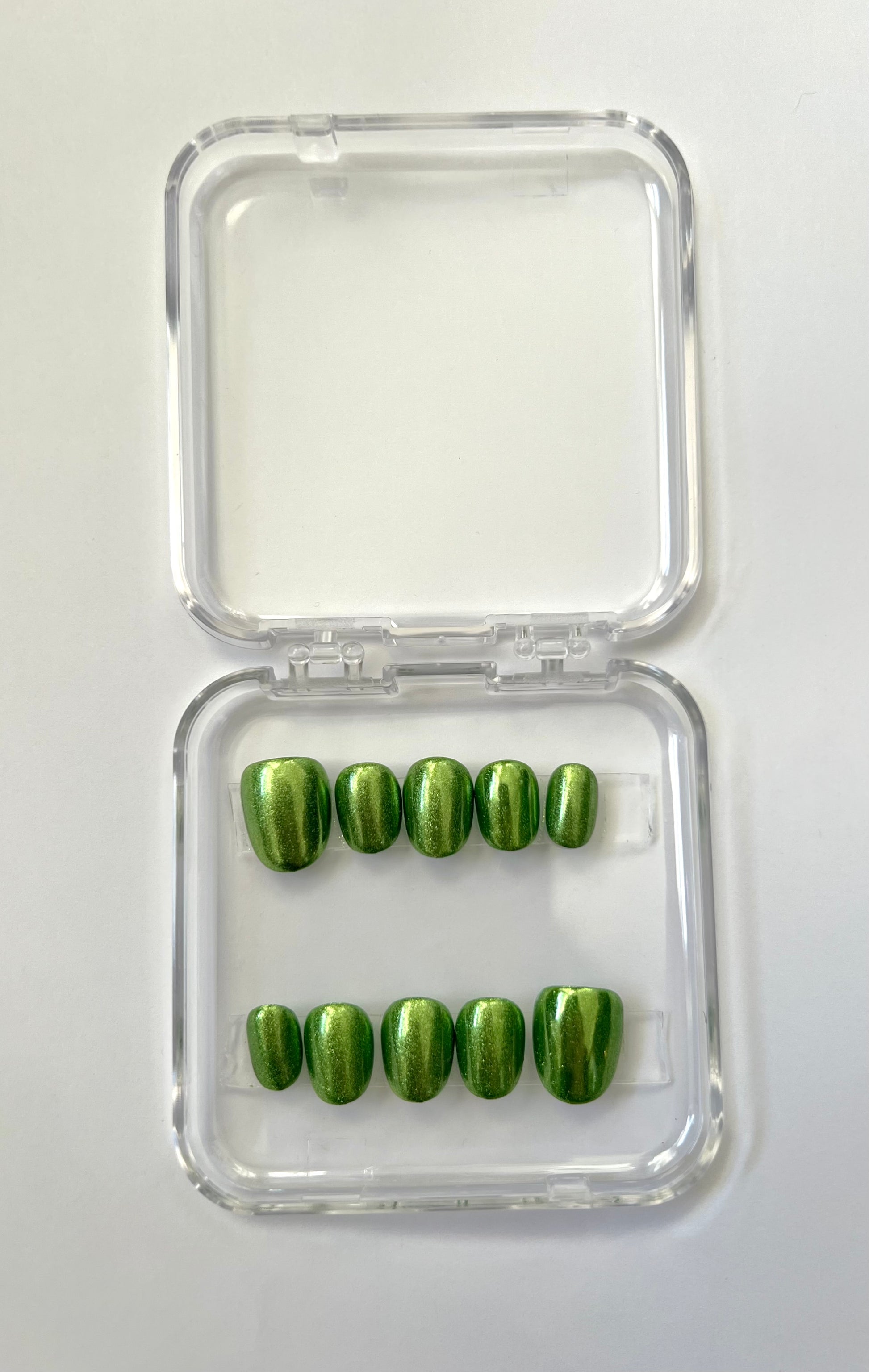 These nails shine with a captivating green chrome finish, offering a luxurious, jewel-like sparkle that’s as bold as it is elegant. Perfect for adding a touch of glamour to any look.
