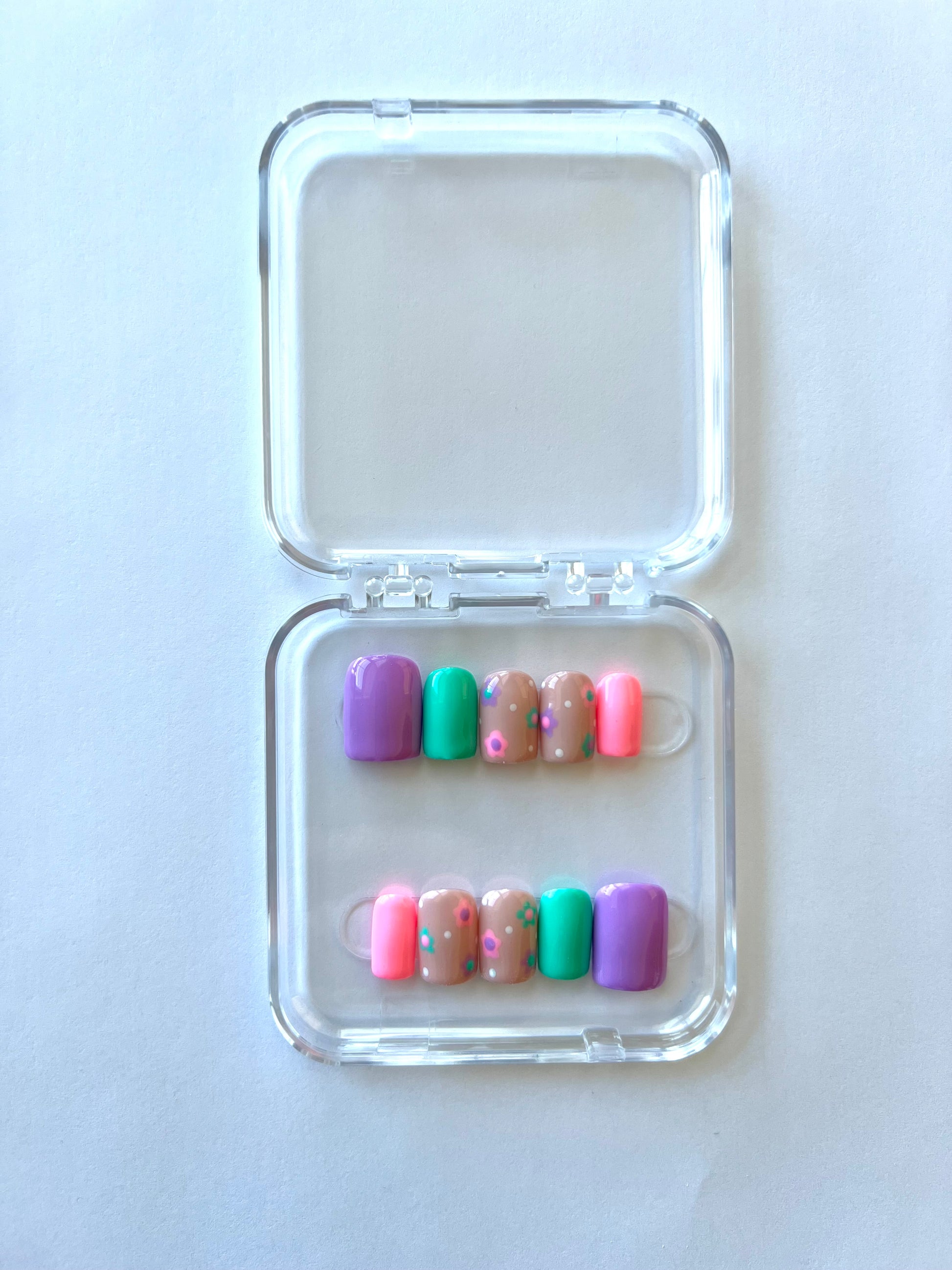 These nails feature a stunning mix of purple, teal, and pink, accented by delicate flower designs. A vibrant, yet elegant look that brings a burst of color and charm to your fingertips.