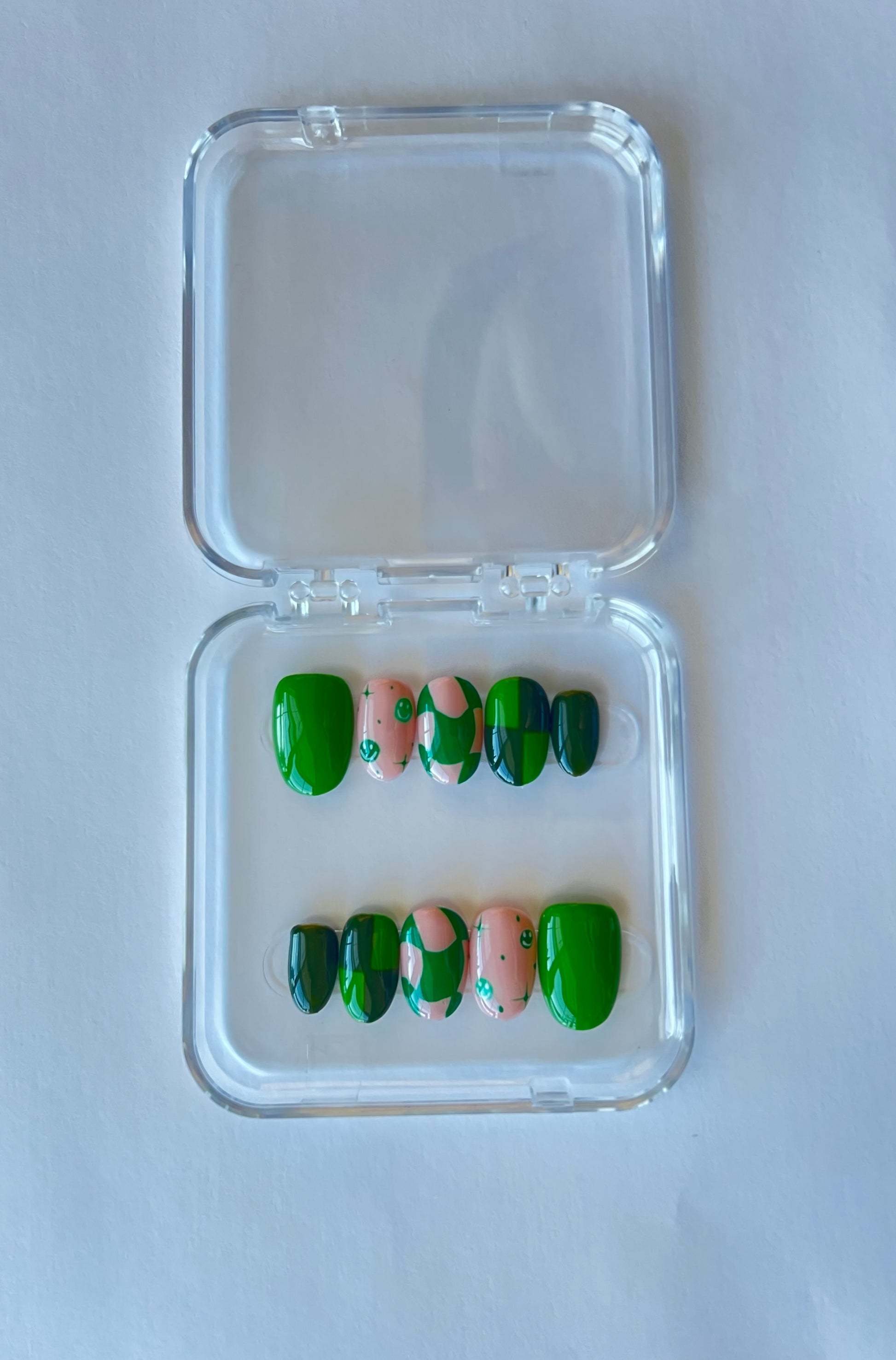 These nails bring a playful twist to bold monochrome green, featuring cheerful smiley designs paired with a trendy checkerboard pattern. A fun and vibrant way to brighten up your look!