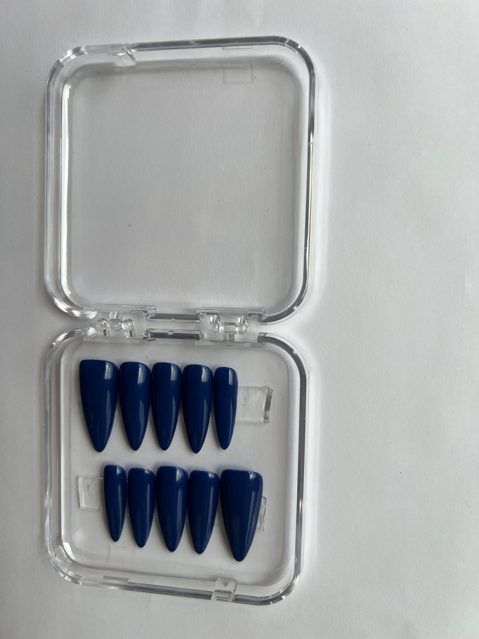 A deep, captivating blue that mirrors the vastness of the ocean under a starlit sky. This rich, dark shade brings an air of mystery and sophistication to your nails, perfect for making a bold yet elegant statement.